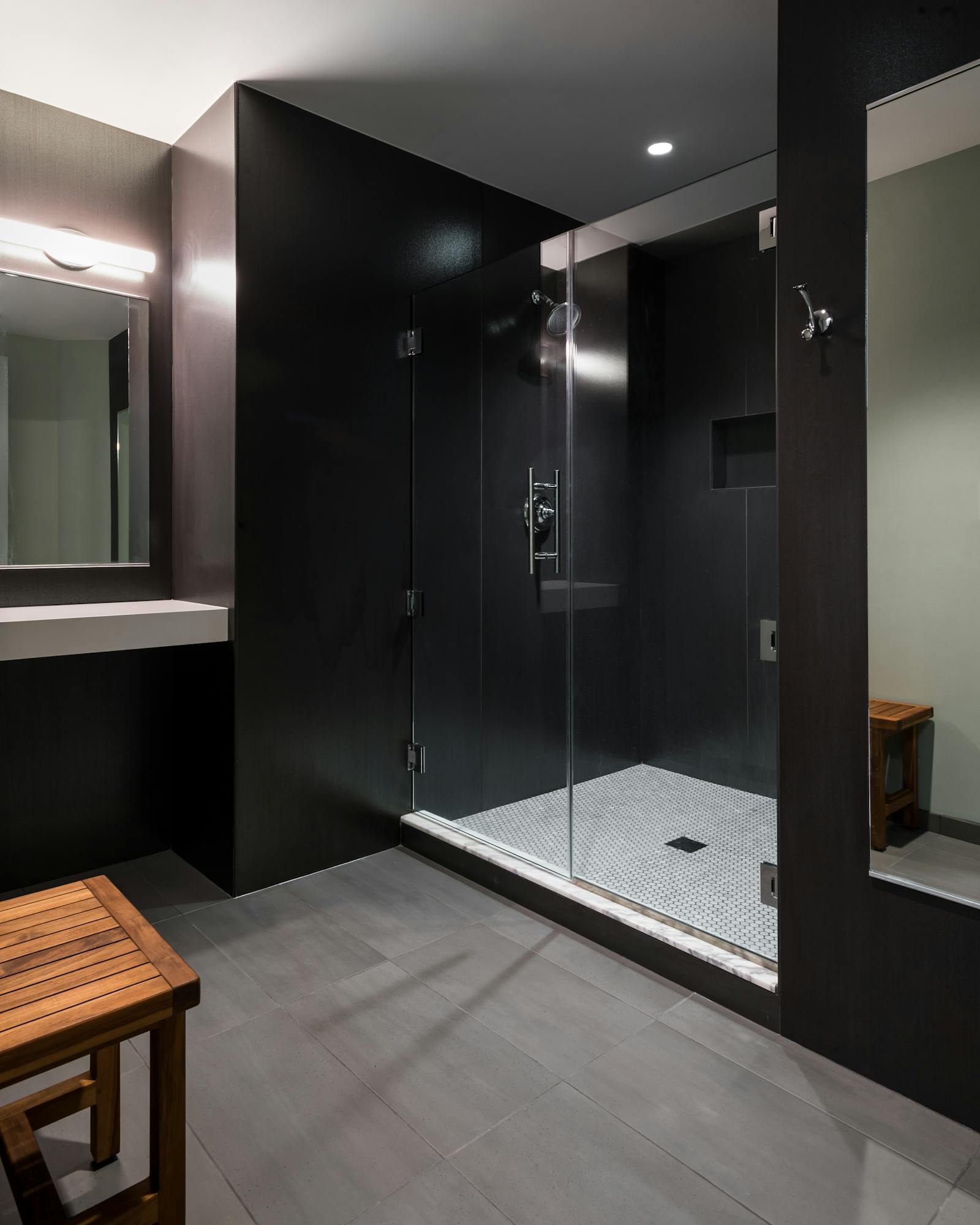 A new backlit glass panel façade was a unique request from the client. The two-story glass storefront modernized the building’s entrance, while clearly identifying the main entry and providing a glimpse inside for passersby. The backlit panels boast a distinctive and striking aesthetic, and are particularly eye-catching when turning onto Montgomery Lane or continuing on Woodmont Avenue towards Bethesda Row. To fully bring the client’s vision to life, this tall curtainwall façade also changes color with its RGB-W lighting element to offer the option of a playful change.