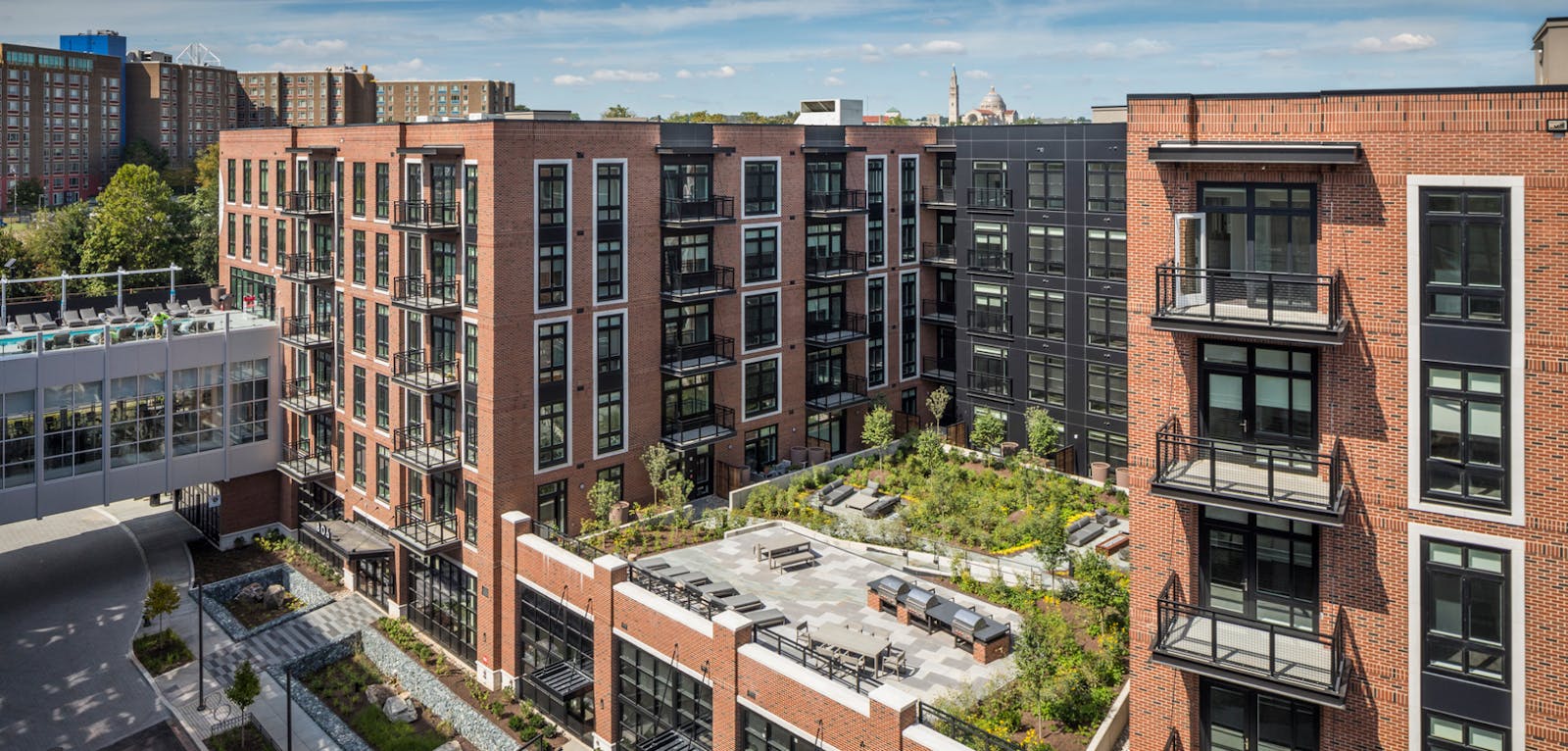 The design of the new structure draws from the site’s industrial character with brick, cast stone, metal panels, and expansive glazing. The bridge itself becomes a landmark feature, with a rooftop pool above a second-floor fitness center. Additional amenities include a bike repair shop, dog spa, business center, yoga and fitness studios, multiple lounges, and communal spaces.