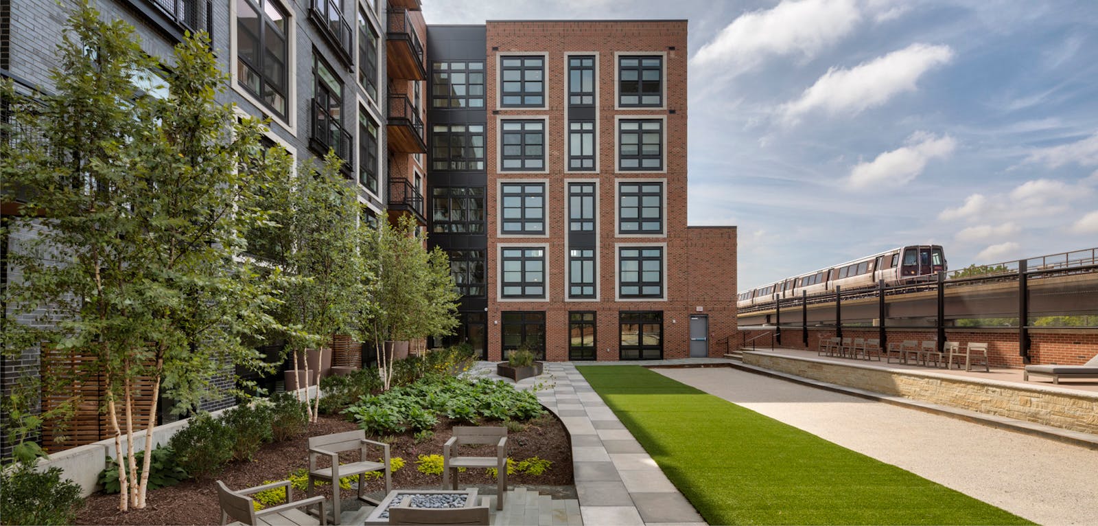 Above the podium, landscaped courtyards offer spaces for recreation and relaxation. At street level, loft-style units are accessed via elevated metal bridges that cross a planted bio-retention zone, creating a distinctive entry experience rooted in the site's industrial character.