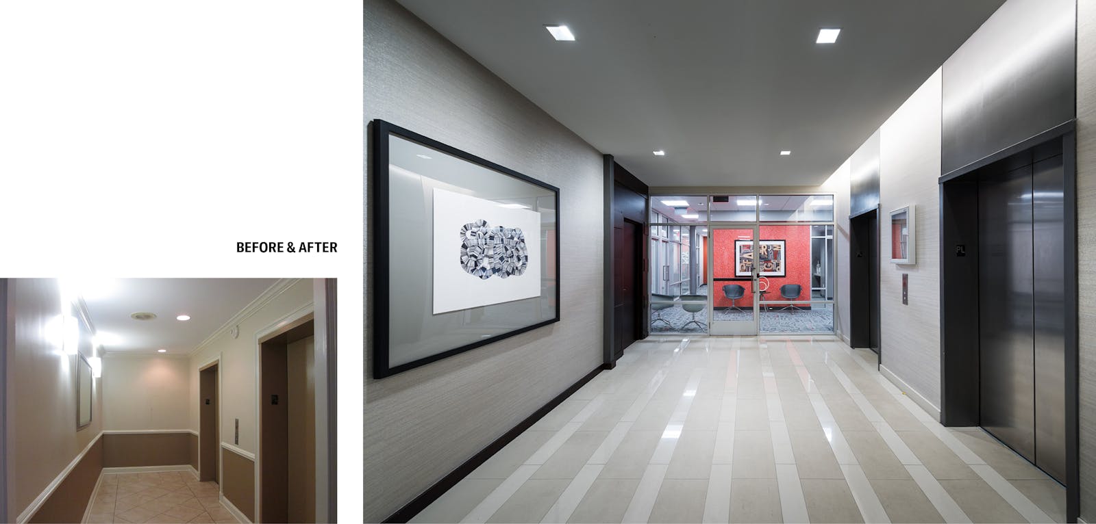 The design team reimagined vacant retail space at Circle Towers to create vibrant, functional amenity areas for residents. The project introduced a state-of-the-art Fitness Center and Business Center, alongside a modernized elevator lobby that blends functionality with contemporary design.