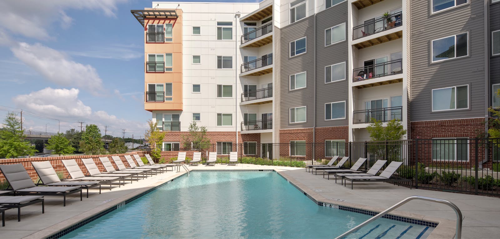 Amenities include two landscaped courtyards, offering residents inviting outdoor spaces for relaxation, socializing, and connection with nature. One is centered around a resort-style pool, while the other features outdoor kitchens and inviting gathering spaces.