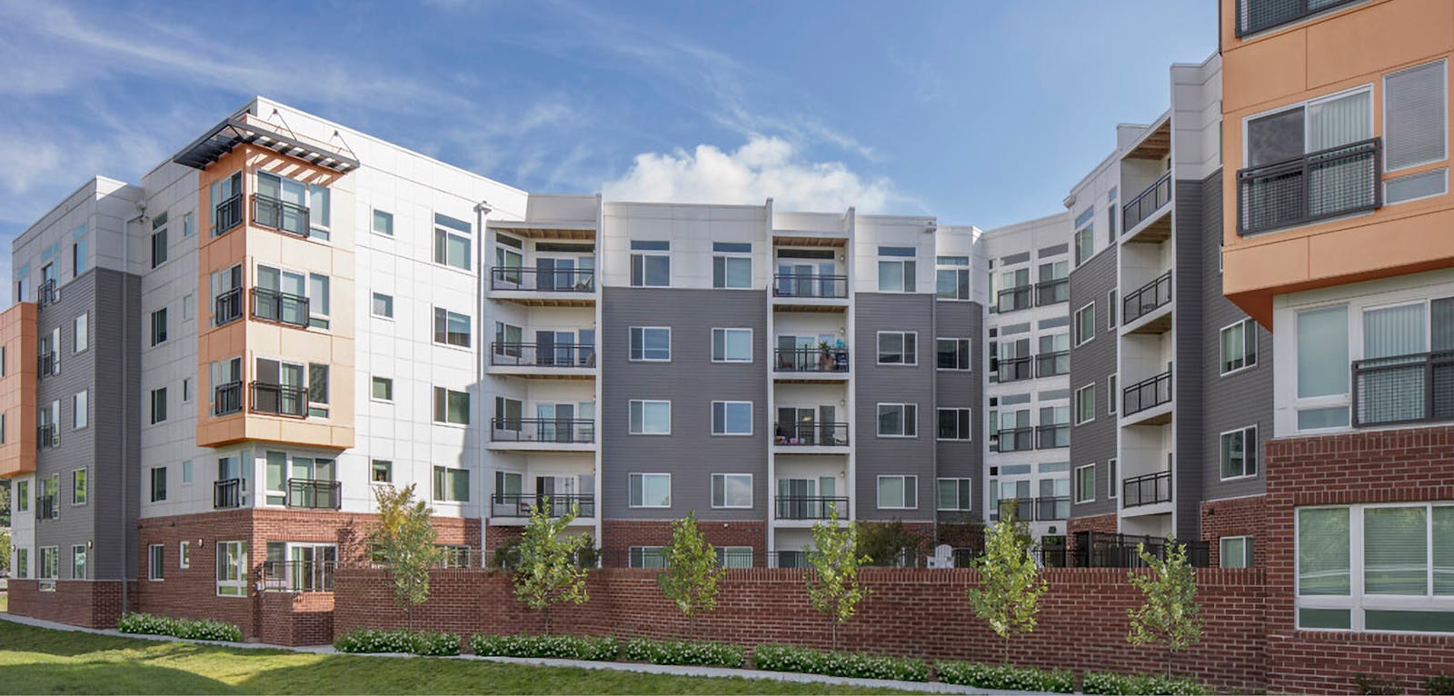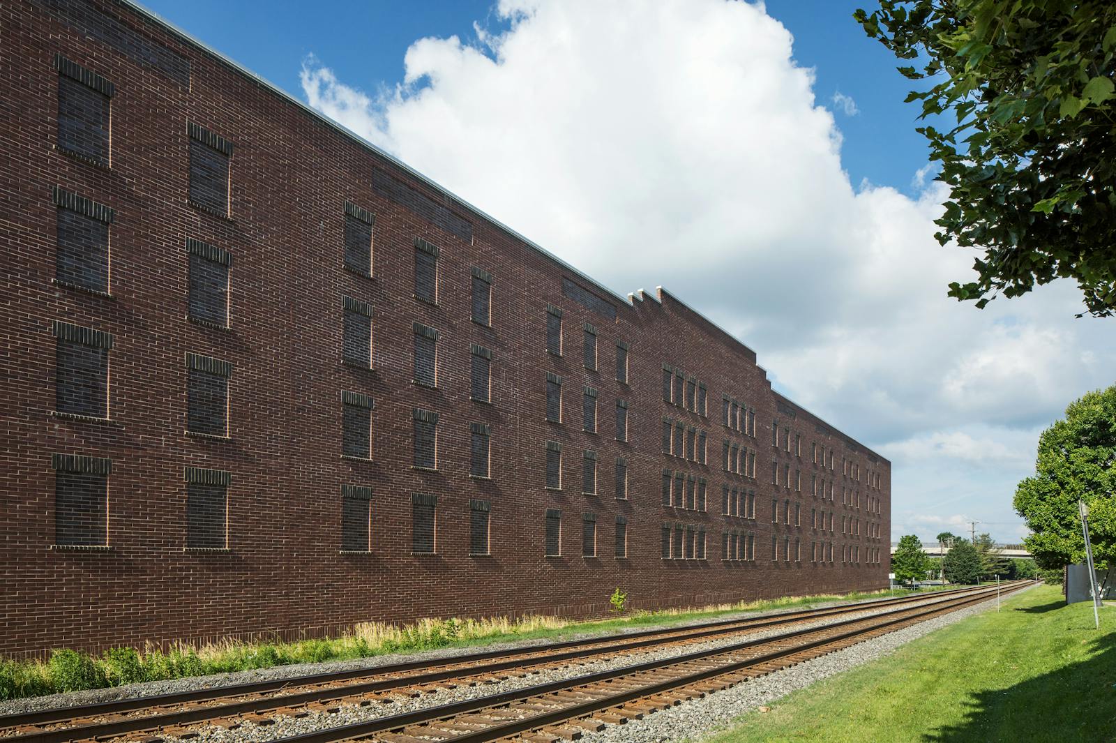 The north façade, located just 30 feet from the CSX rail line, is new construction that thoughtfully recalls the industrial language of historic northeastern warehouses. To address the proximity to active tracks, the building incorporates extensive soundproofing to ensure acoustic comfort for residents.