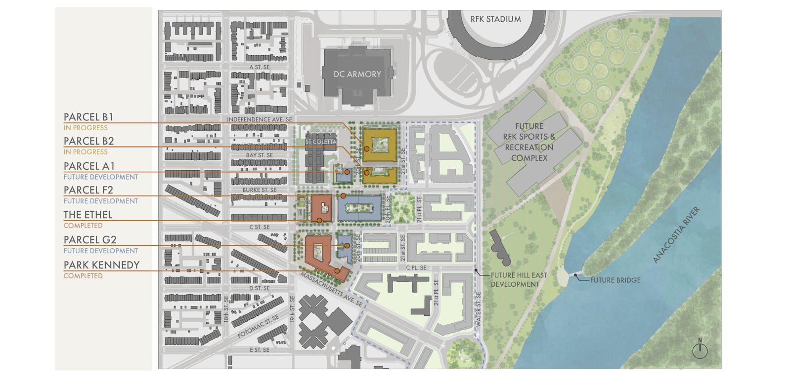 Parcels B1 and B2, Phase 2 of the 68-acre Hill East development, will help transform the neighborhood into a vibrant, sustainable, and connected waterfront community. Anchored by the new Robert F. Kennedy Linear Park, the project reconnects the site to the Anacostia Waterfront through a walkable streetscape that encourages social interaction and a strong sense of place. Designed to achieve Net Zero Energy with an innovative geothermal system, it reflects a commitment to both architectural excellence and environmental responsibility.