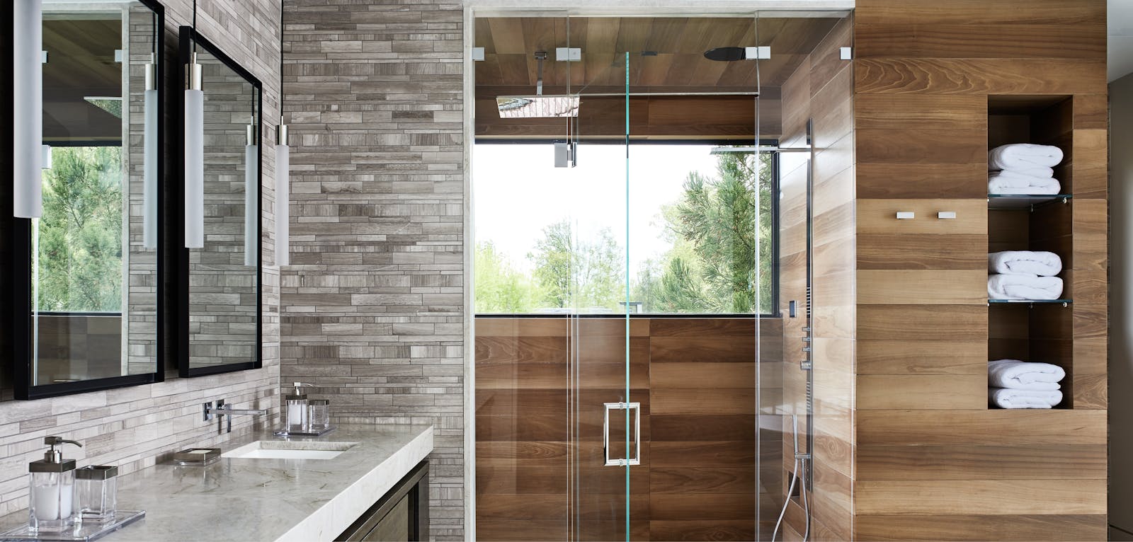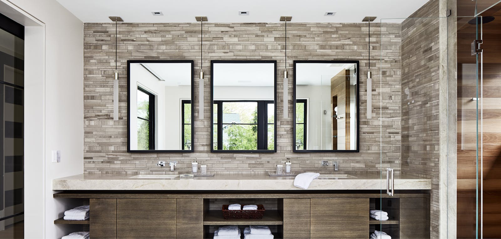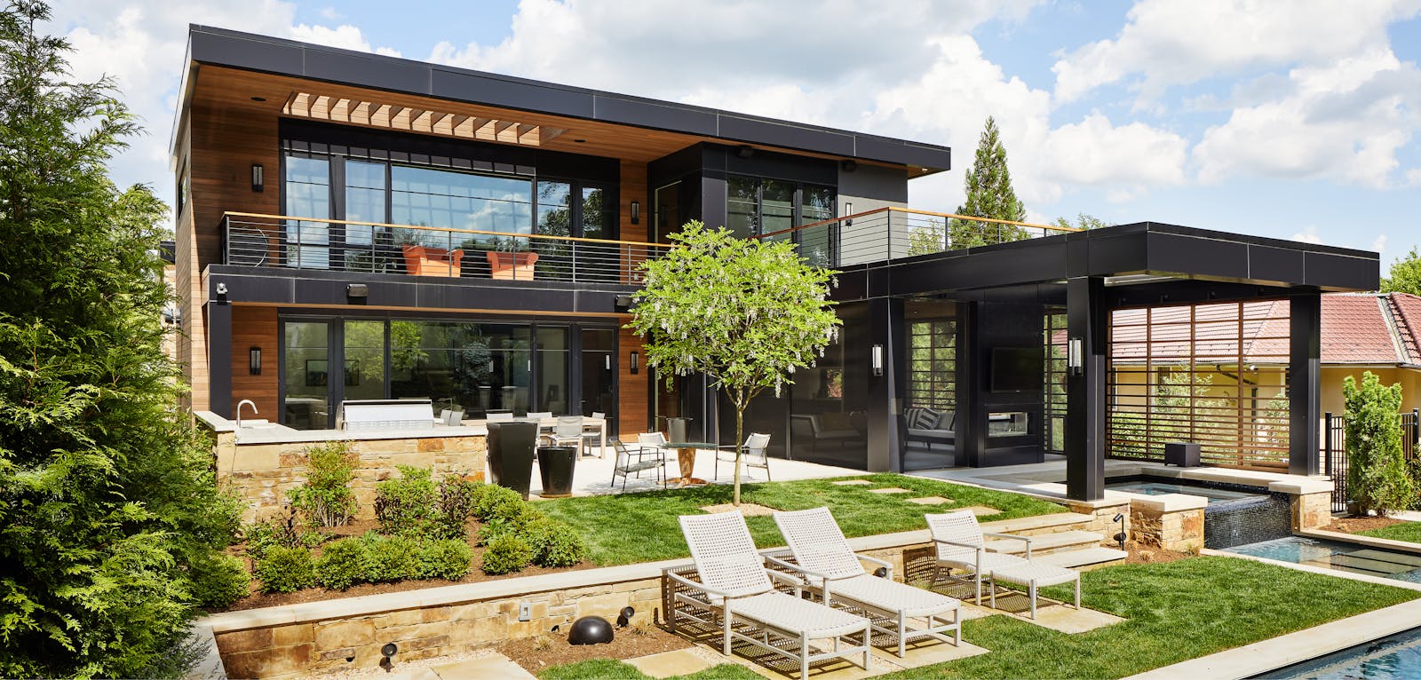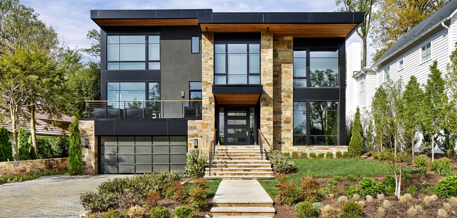 This contemporary split-level home evokes a modern and deliberate appearance on the streetscape. The exterior palette of materials is a vocabulary of stone, glass, metal, wood and stucco. Deep cantilevered roof projections shading generous expanses of glass with field stone clad entry piers, draw one’s imagination inside. The generous use of glass window-wall openings floods the interior space with natural light. Tying the interior plan together – with a vertical hall of expansive windows and daylight – is a wood and steel, precisely crafted, open stair. An expansive family room was designed to extend seamlessly from the large kitchen dining area to the rear yard pool terrace and covered porch. White walls and warmly stained wide plank oak flooring were used to create a serene backdrop for the array of inventively contemporary built-in casework thorough out the home. Each private bath was designed with a unique selection of wall and floor tile décor.