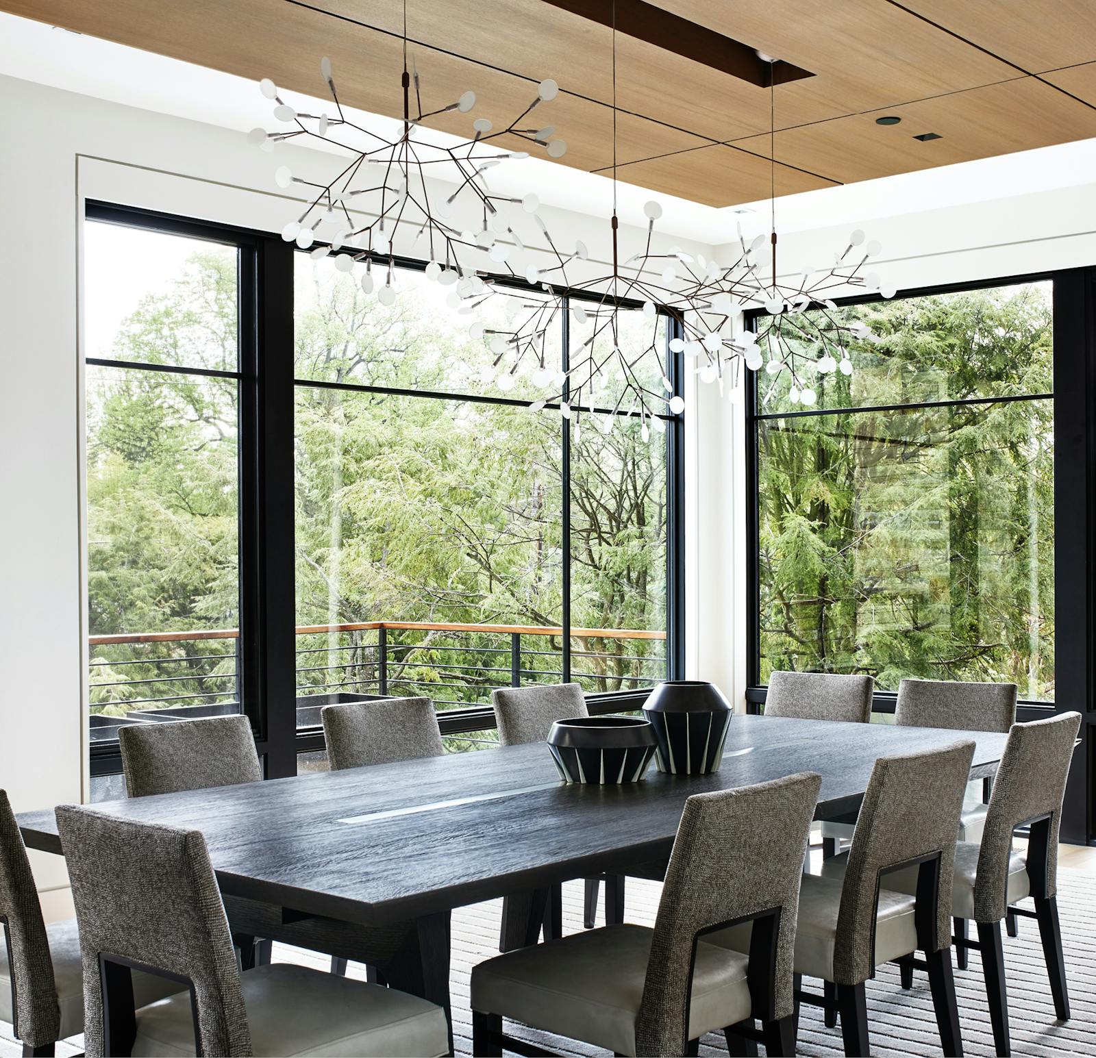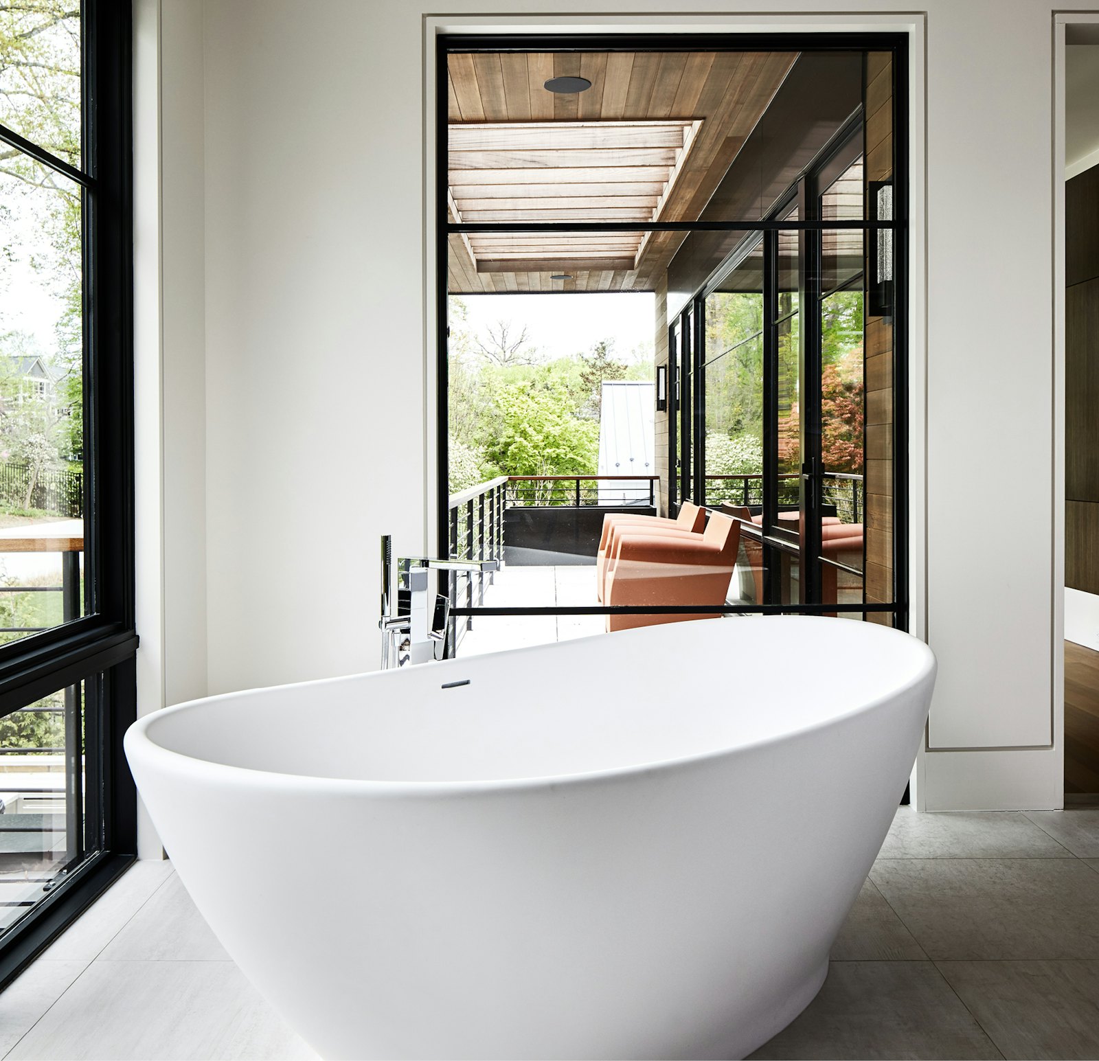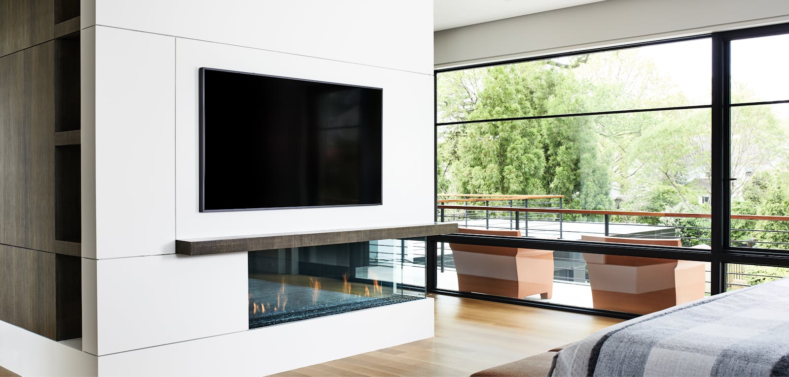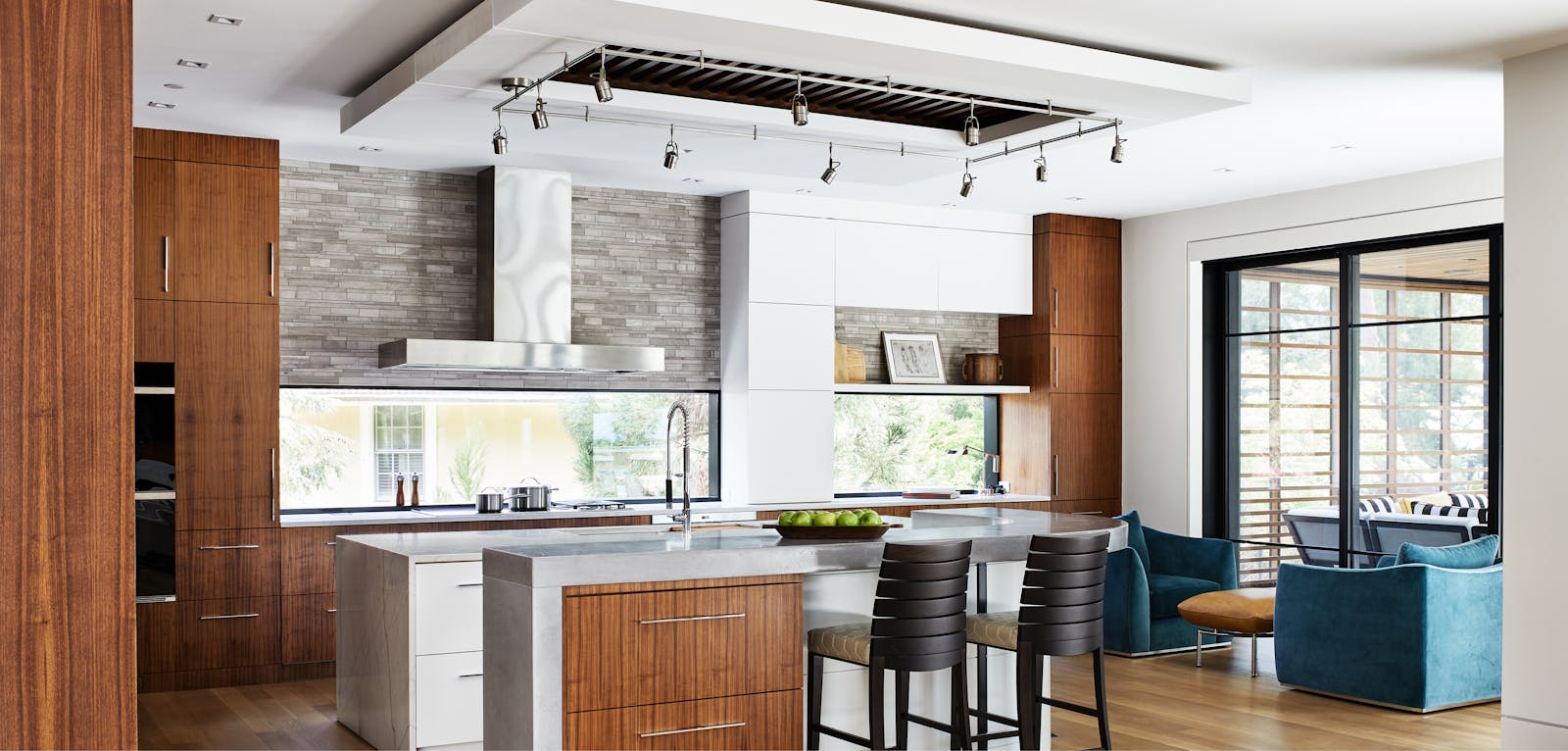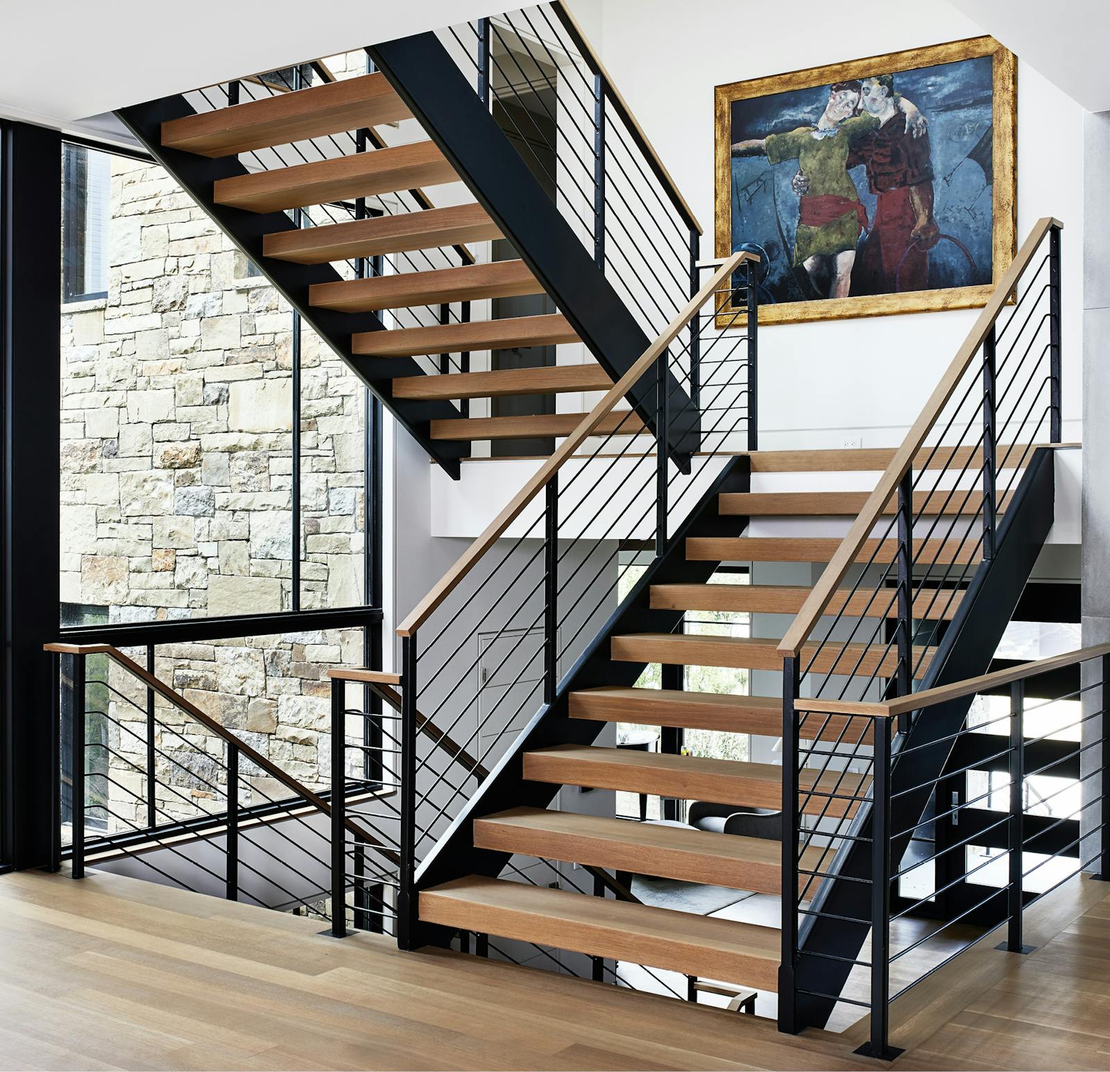 This contemporary split-level home evokes a modern and deliberate appearance on the streetscape. The exterior palette of materials is a vocabulary of stone, glass, metal, wood and stucco. Deep cantilevered roof projections shading generous expanses of glass with field stone clad entry piers, draw one’s imagination inside. The generous use of glass window-wall openings floods the interior space with natural light. Tying the interior plan together – with a vertical hall of expansive windows and daylight – is a wood and steel, precisely crafted, open stair. An expansive family room was designed to extend seamlessly from the large kitchen dining area to the rear yard pool terrace and covered porch. White walls and warmly stained wide plank oak flooring were used to create a serene backdrop for the array of inventively contemporary built-in casework thorough out the home. Each private bath was designed with a unique selection of wall and floor tile décor.