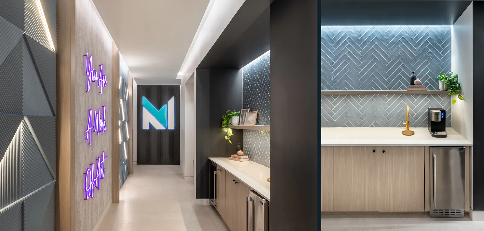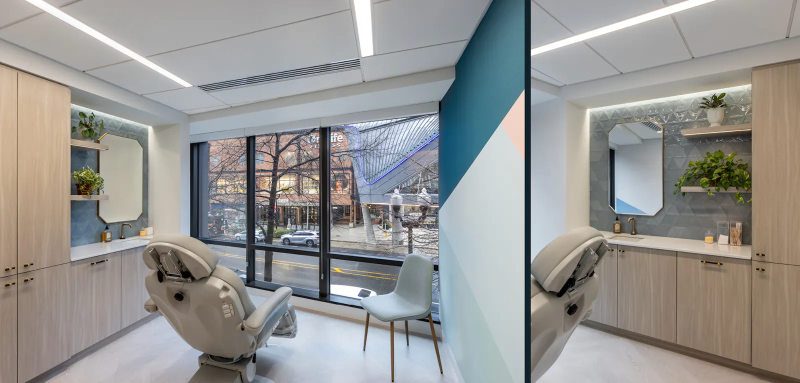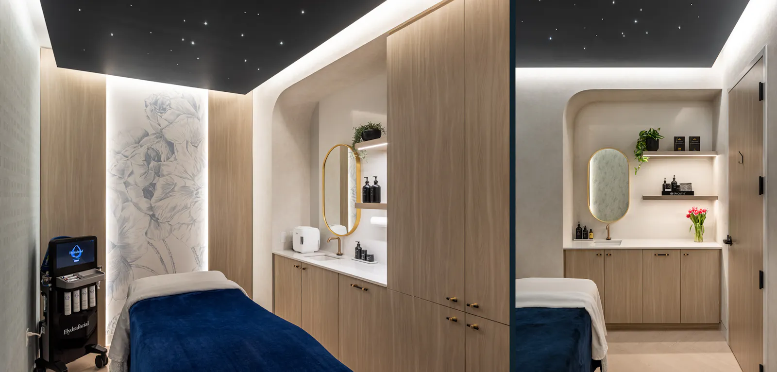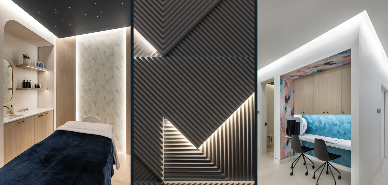 This 2,000 SF Medspa expansion in Arlington, Virginia offers a serene and luxurious retreat designed to enhance client experience. A welcoming entry area highlights a sculptural wood wall with concealed lighting, functional millwork and neon lit inspirational wall. Custom twinkling star light ceilings create a celestial ambiance in the spa rooms encouraging relaxation and tranquility. Indirect lighting throughout further softens the space, providing a gentle glow that complements the calming atmosphere. Textured wallcoverings add depth and tactile interest enriching the overall sensory experience. Thoughtfully designed with wellness in mind, the expansion includes additional treatment rooms, spa rooms ensuring a seamless and rejuvenating visit for all.