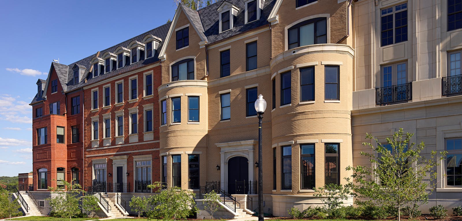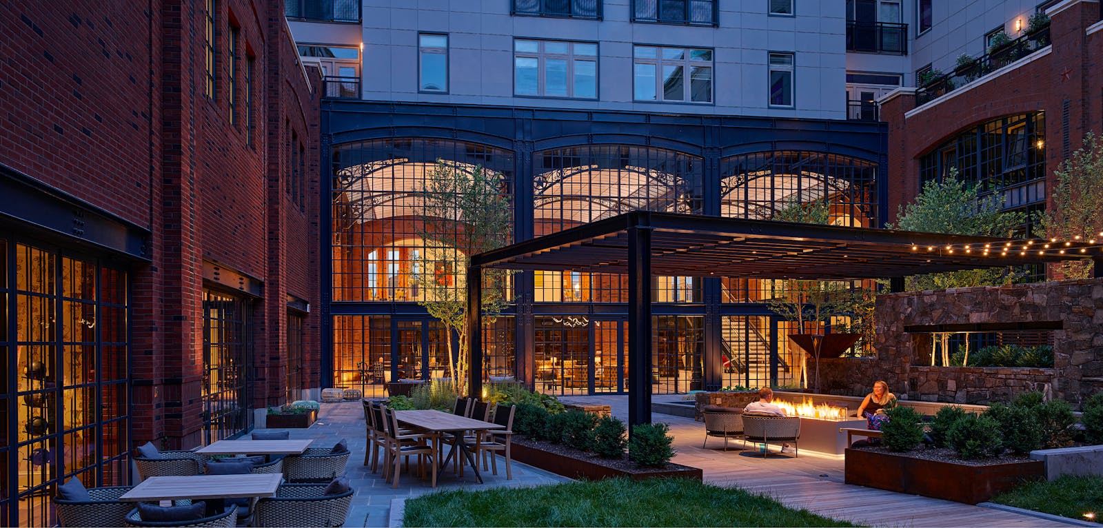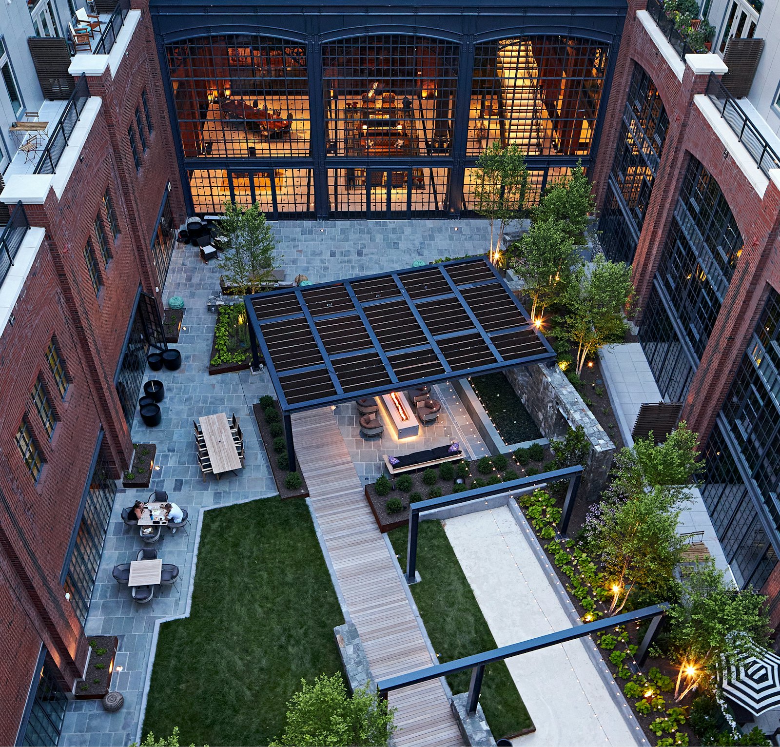 The architecture reflects the character of the surrounding community, with street-facing facades articulated as rowhomes and mansions seamlessly blending into the architectural fabric and conveying a sense of organic neighborhood evolution. A two-story atrium opens to a landscaped courtyard, anchoring the interior and connecting residents to a range of outdoor spaces, including private yards, a bocce court, and a yoga lawn.
