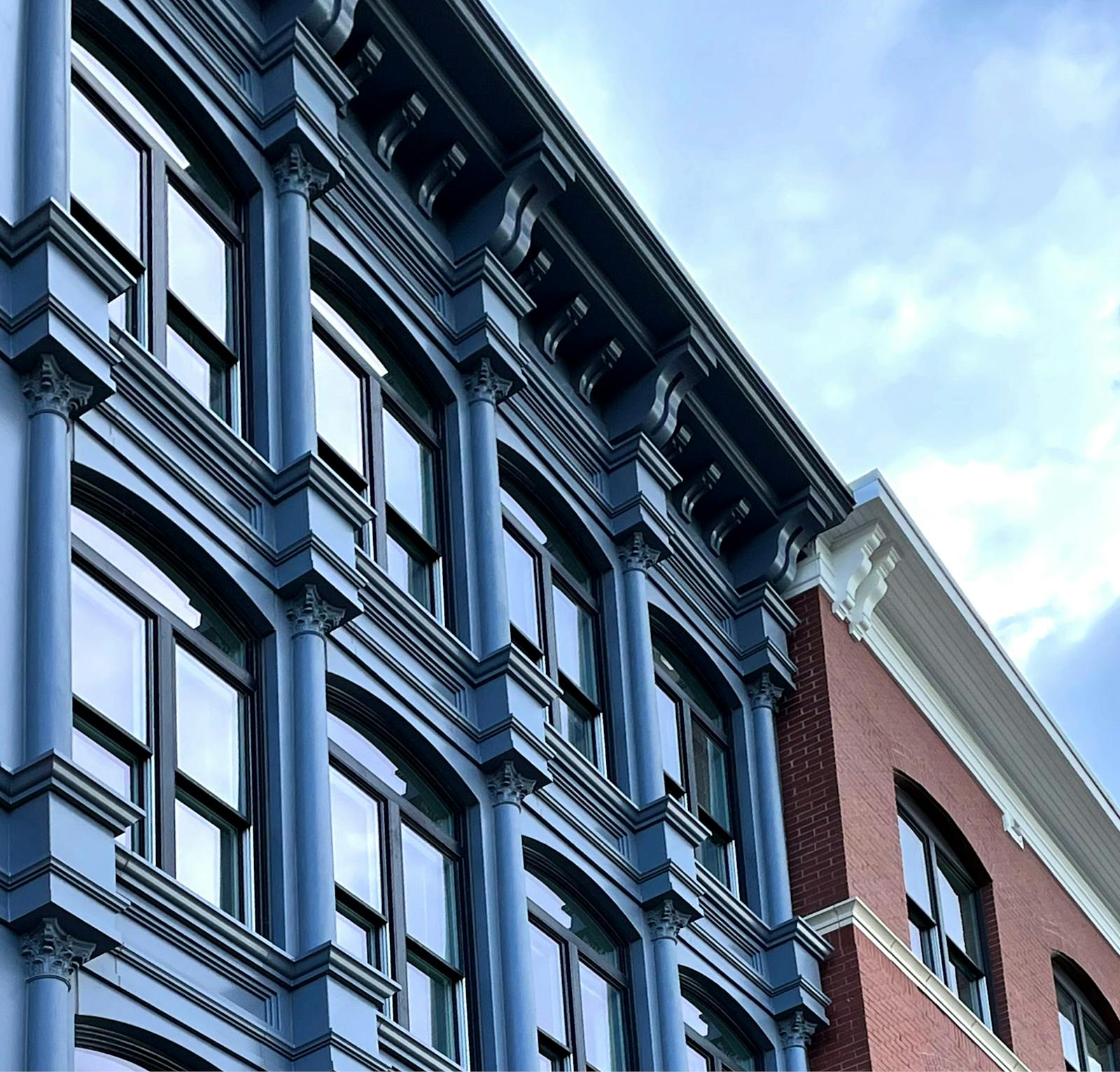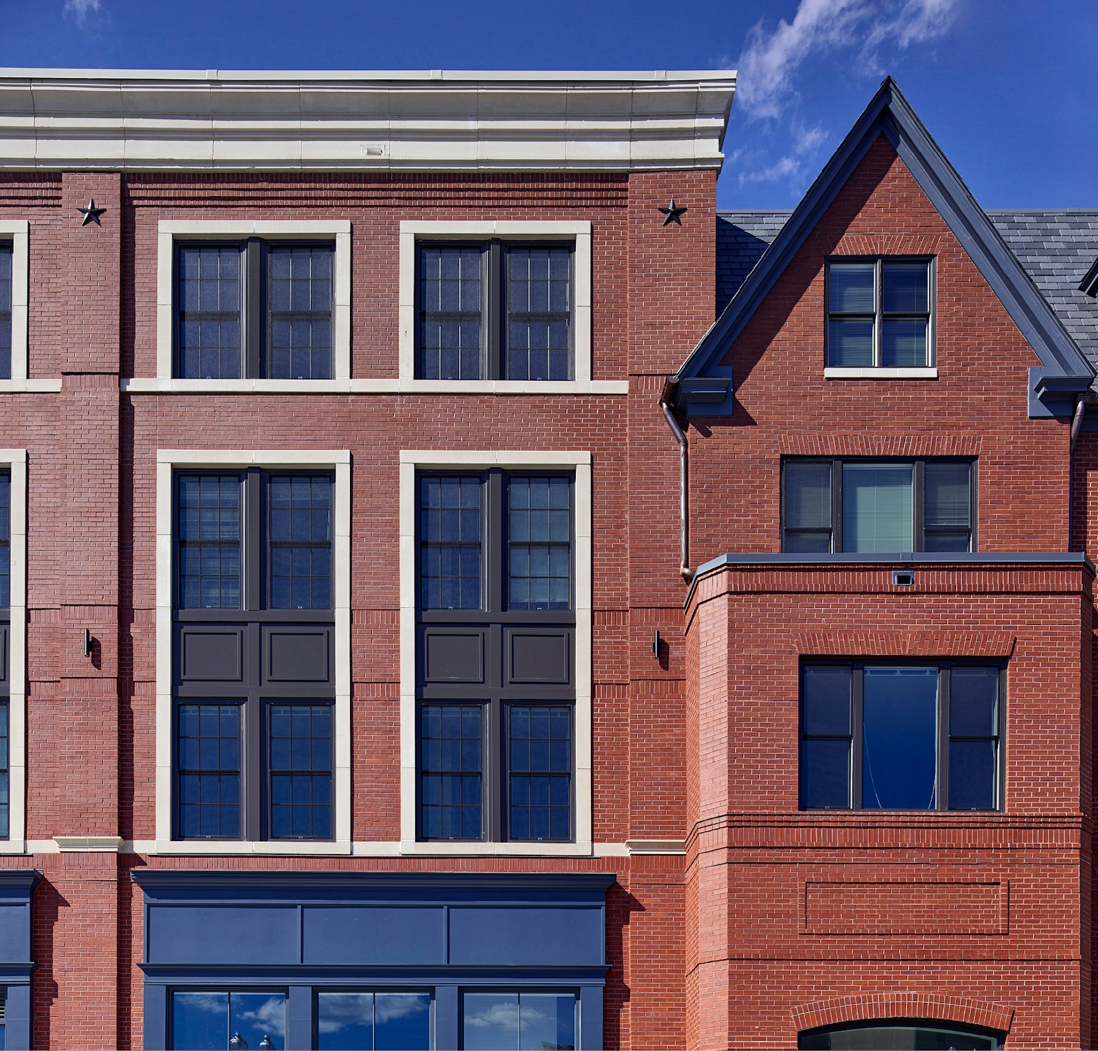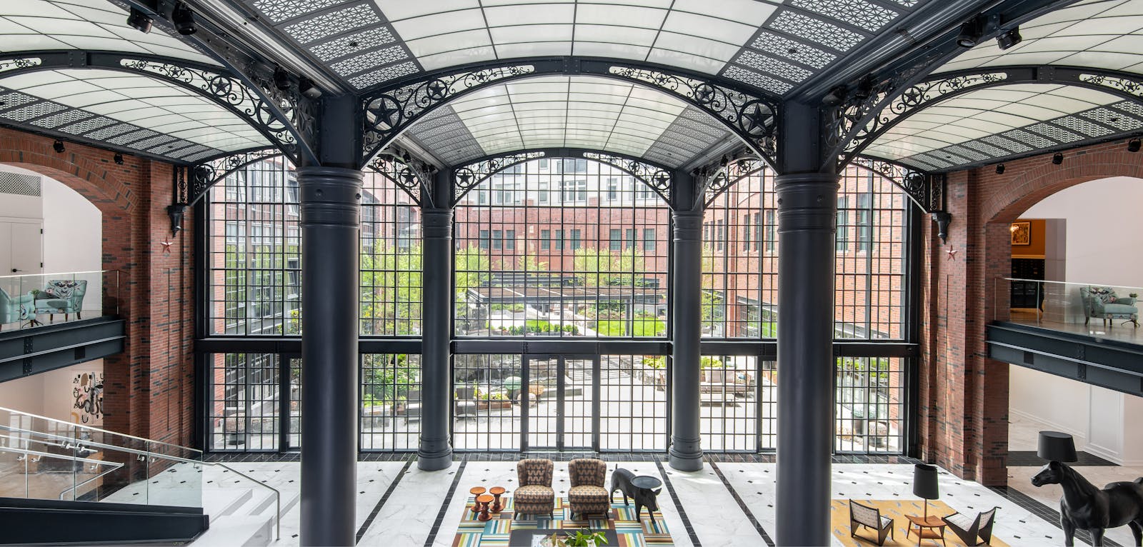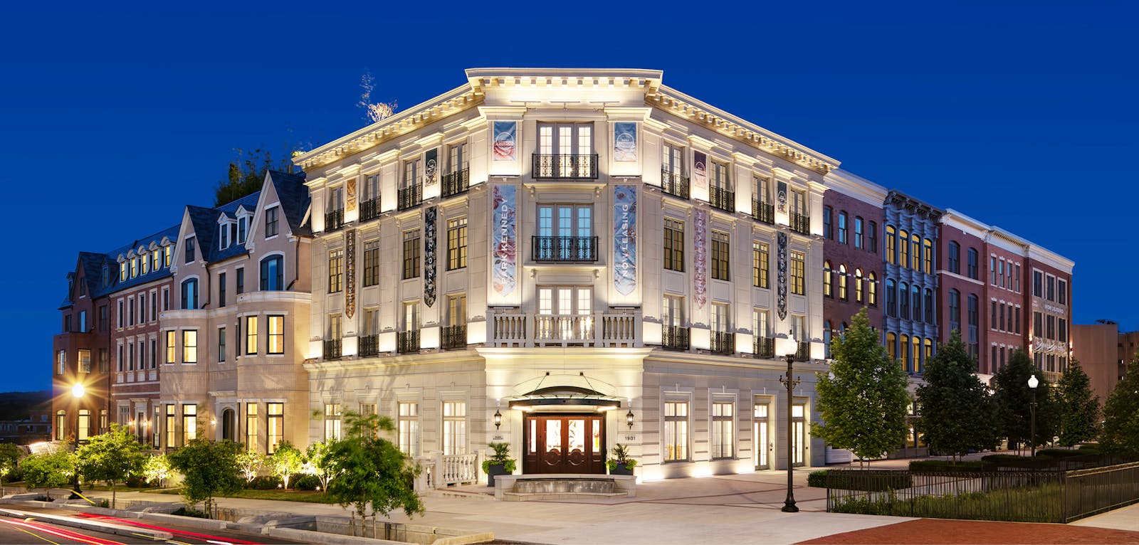 The architecture reflects the character of the surrounding community, with street-facing facades articulated as rowhomes and mansions seamlessly blending into the architectural fabric and conveying a sense of organic neighborhood evolution. A two-story atrium opens to a landscaped courtyard, anchoring the interior and connecting residents to a range of outdoor spaces, including private yards, a bocce court, and a yoga lawn.