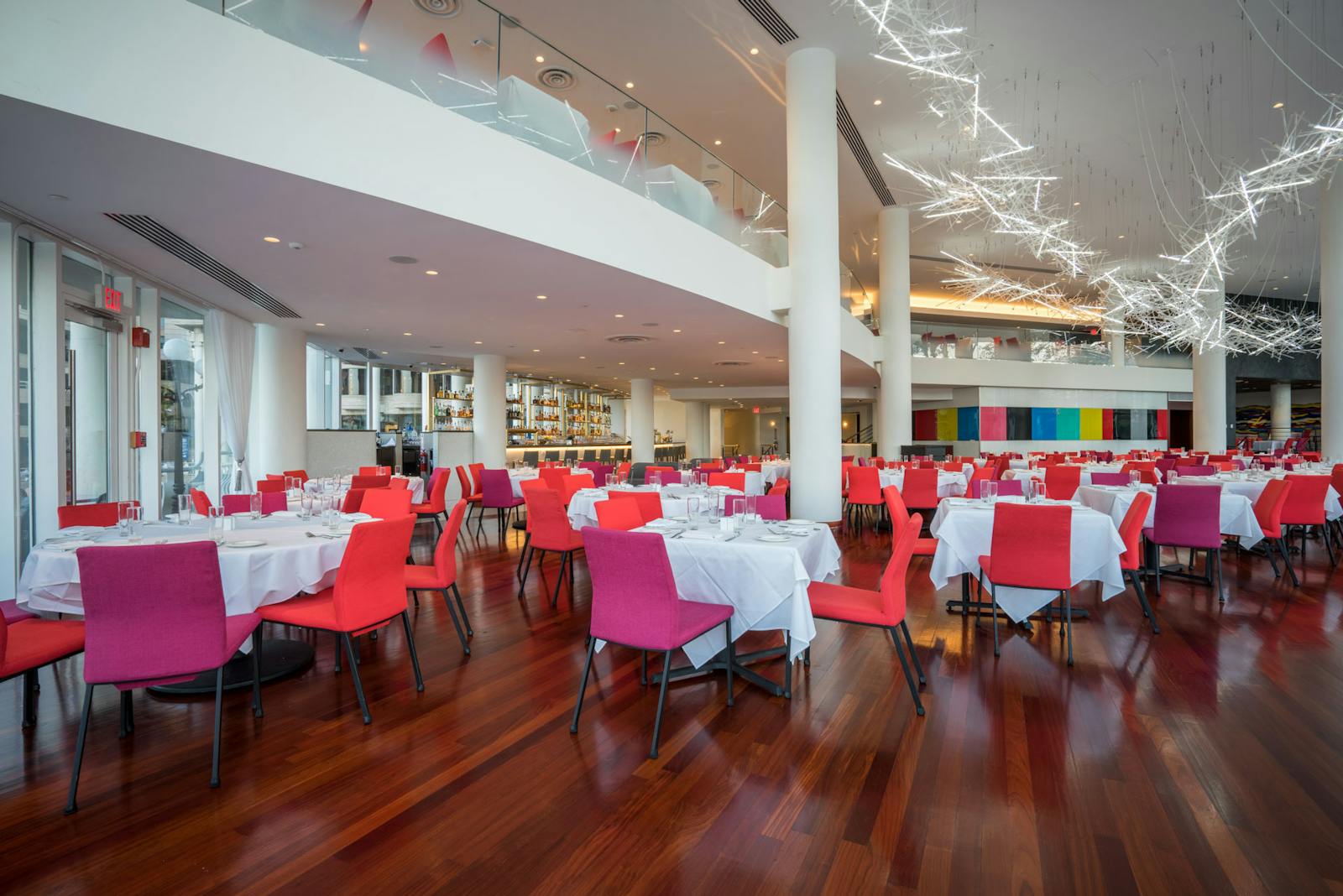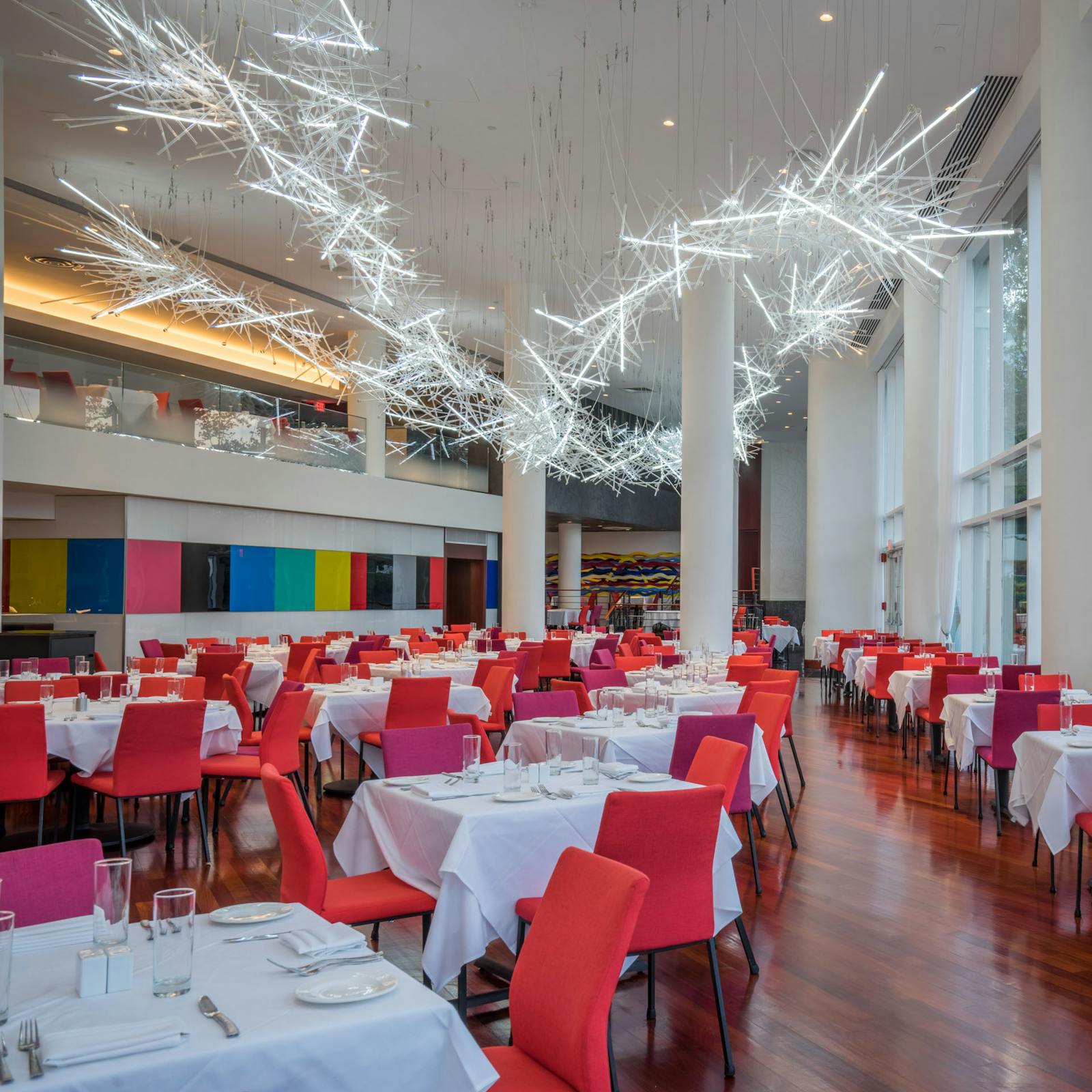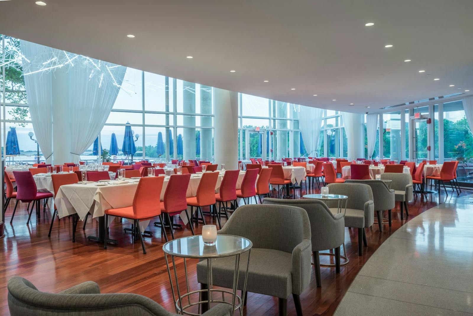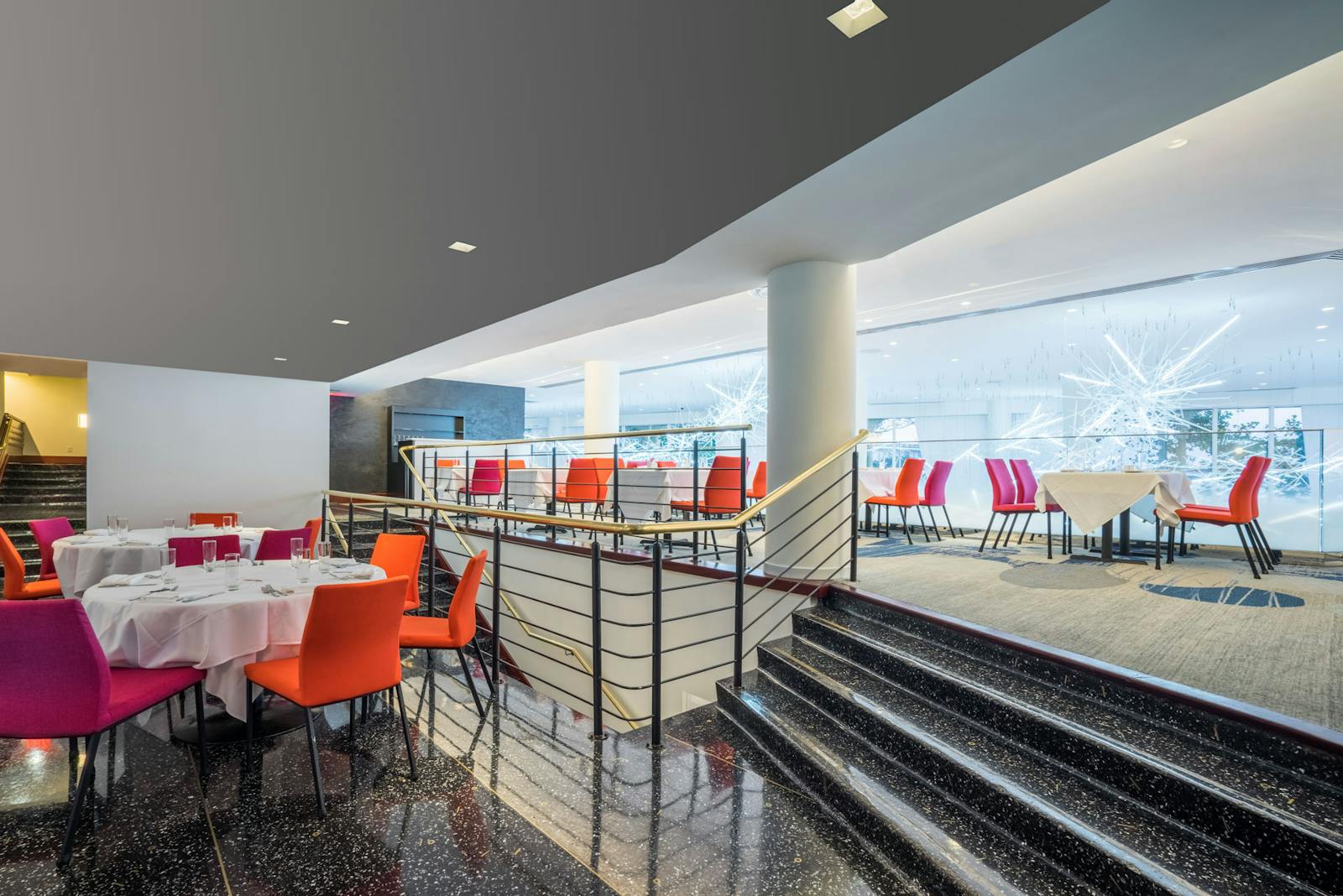 When Sequoia, Georgetown’s well-established dining destination at The Washington Harbour, embarked on a reimagining of the 26,600 square foot restaurant, GTM|Architects worked with the Owner and Jeffery Beers International interior designers to realize the restaurant’s significant renovation. The relocation of Sequoia’s bar from the second-floor mezzanine to the main floor created a new, dynamic focal point for the restaurant. Incorporating the Owner’s love of contemporary art pieces was also paramount to the redesign, utilizing lighting, furniture, and other design elements driven by artists into one cohesive design.