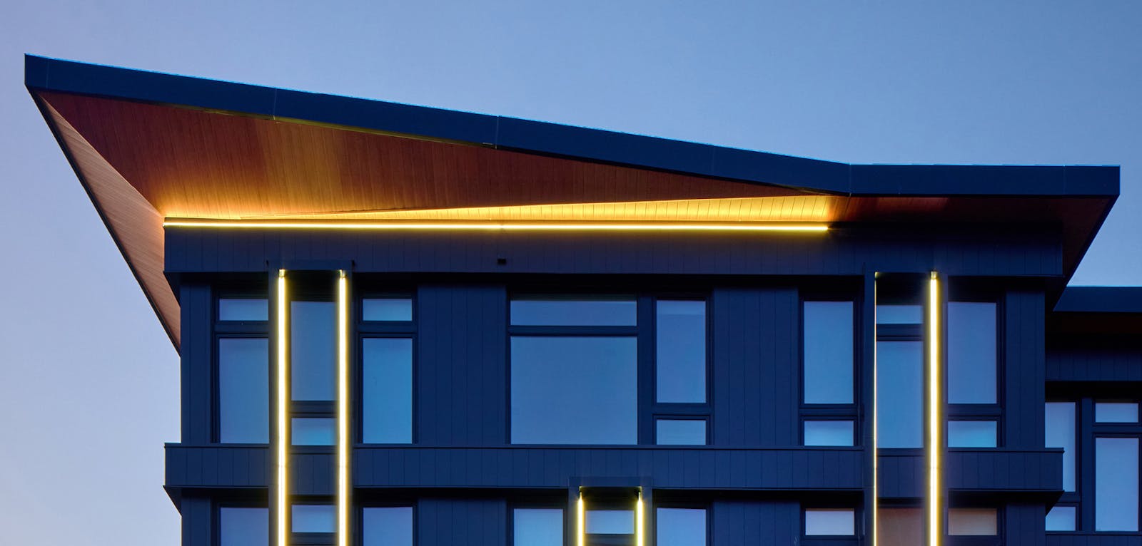 Drawing inspiration from the intricate patterns of African woven textiles, the façade reinterprets traditional geometry through contemporary materials and form. Illuminated two-story metal-paneled shadowboxes unfold rhythmically across the exterior, interwoven with horizontal bands and geometric window arrangements that evoke the art of weaving. This layering crafts a compelling play of light, texture, and depth that brings the building to life.